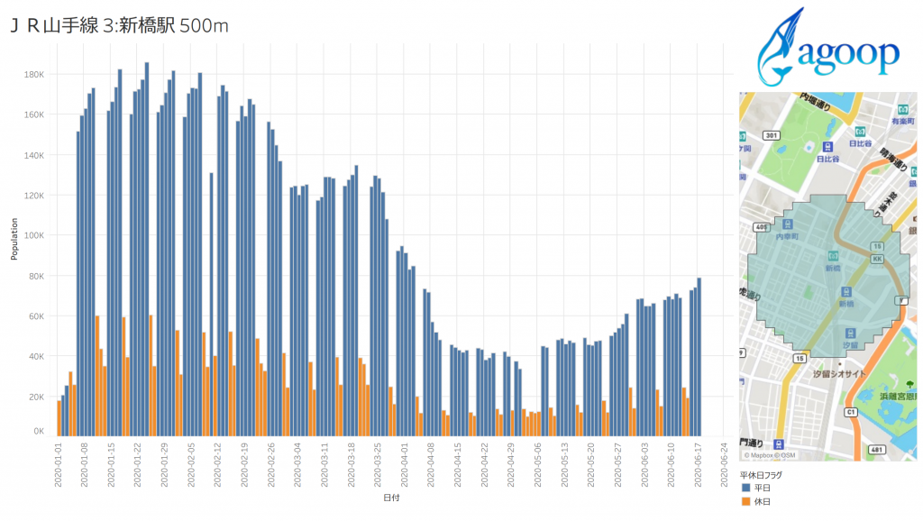 『新型コロナウイルス拡散における人流変化の解析』資料のグラフを時間別から日別に変更しました 2020.06.18 現在Agoopは、全国主要エリアにおける日次人流変化解析を日次で更新して掲載しております。本日より『新型コロナウイルス拡散における人流変化の解析』資料のグラフを時間別平均から日別平均に変更しました。 変更前:時間別平均グラフ 変更後:日別平均グラフ 『新型コロナウイルス拡散における人流変化の解析』資料 <東日本エリア>https://corporate-web.agoop.net/pdf/covid-19/agoop_analysis_coronavirus.pdf<西日本エリア>https://corporate-web.agoop.net/pdf/covid-19/agoop_analysis_coronavirus_west.pdf なお、メディア・報道機関などに提供している元データに関しましては従来通り時間別・日別を提供いたします。 今後も新型コロナウイルス感染症拡大防止対策に関わる取り組みを支援するため、価値あるデータを提供できるよう邁進してまいります。 お知らせ一覧 前の記事 後の記事
