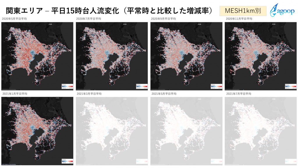 『エリア別の人流増減分析』レポートを最新版に更新しました 2021.02.09 Agoopホームページの特設サイトに掲載中の『エリア別の人流増減分析』レポートを本日より2ヶ月毎の更新に変更して2021年1月分を追加しました。1回目の緊急事態宣言後、都心で著しく人出が減少し郊外へ分散している様子がみられました。その後人出は回復傾向になりましたが、7月以降大きな変化のない状況が継続しておりました。2021年1月は緊急事態宣言により都心の人出が減少して郊外で増加した様子がわかります。 『エリア別の人流増減分析』レポートhttps://corporate-web.agoop.net/pdf/covid-19/agoop_analysis_coronavirus_fluctuation.pdfこのレポートは、経済指標正常化や感染拡大防止施策などに役立てることを目指して分析したもので、新型コロナウルス感染症の影響による人出の変化を見ることができます。今後も新型コロナウイルス感染症拡大防止対策および経済復興に関わる取り組みを支援するため、価値あるデータを提供できるようまい進していきます。 お知らせ一覧 前の記事 後の記事