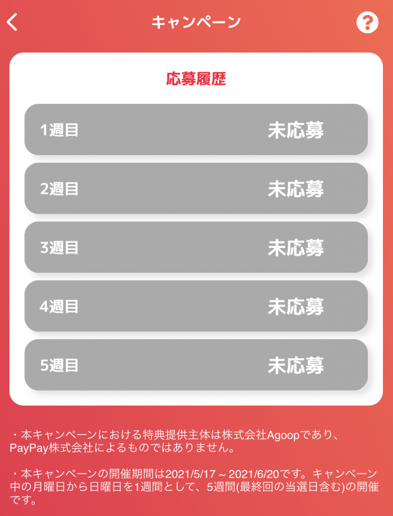 1週目  5月17日(月)~ 23日(日) 5月23日(日)午後11時59分  5月26日(水)