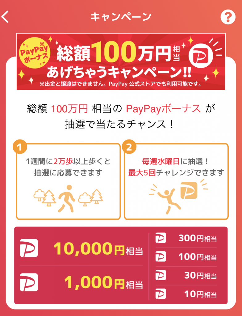 「WalkCoin」を利用して1週間(月~日曜日)に2万歩以上歩くと、5月17日(月)から6月20日(日)の毎週水曜日の抽選(計5回)に応募でき、抽選でPayPayボーナス(1万円相当、1,000円相当、300円相当、100円相当、30円相当、10円相当)が当たります。(最大5回応募可能)