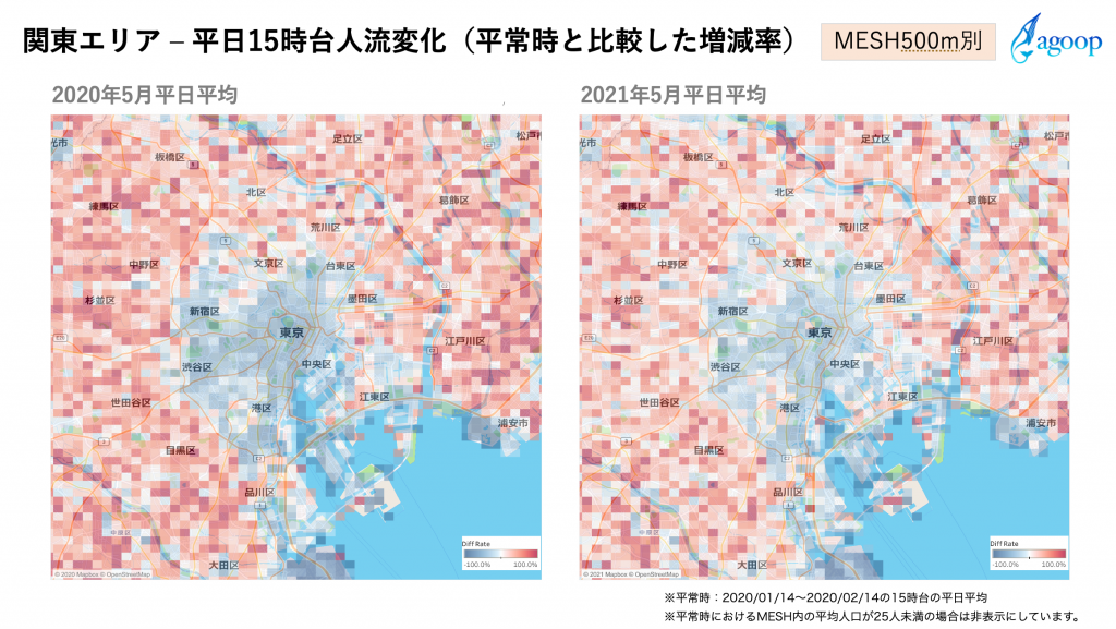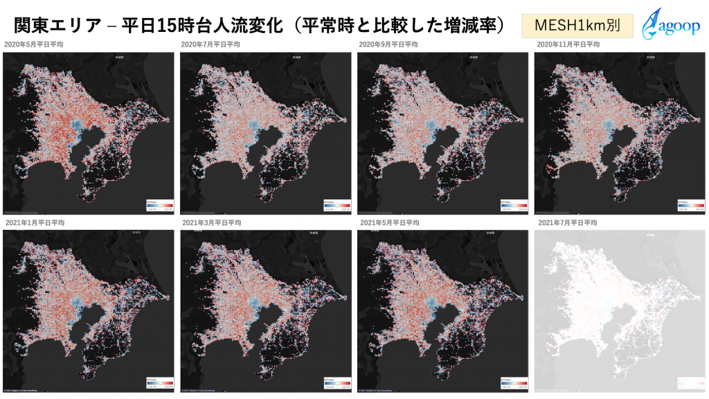 『エリア別の人流増減分析』レポートを最新版に更新しました 2021.06.08 Agoopホームページの特設サイトに掲載中の『エリア別の人流増減分析』レポートに2021年5月分を本日追加しました。 新型コロナウイルス感染症への感染者拡大に伴う2回目緊急事態宣言の2021年1月以降、都心で人出が減少して郊外で増加している様子が続いています。 『エリア別の人流増減分析』レポートhttps://corporate-web.agoop.net/pdf/covid-19/agoop_analysis_coronavirus_fluctuation.pdfこのレポートは、経済指標正常化や感染拡大防止施策などに役立てることを目指して分析したもので、新型コロナウルス感染症の影響による人出の変化を見ることができます。今後も新型コロナウイルス感染症拡大防止対策および経済復興に関わる取り組みを支援するため、価値あるデータを提供できるようまい進していきます。 お知らせ一覧 前の記事 後の記事