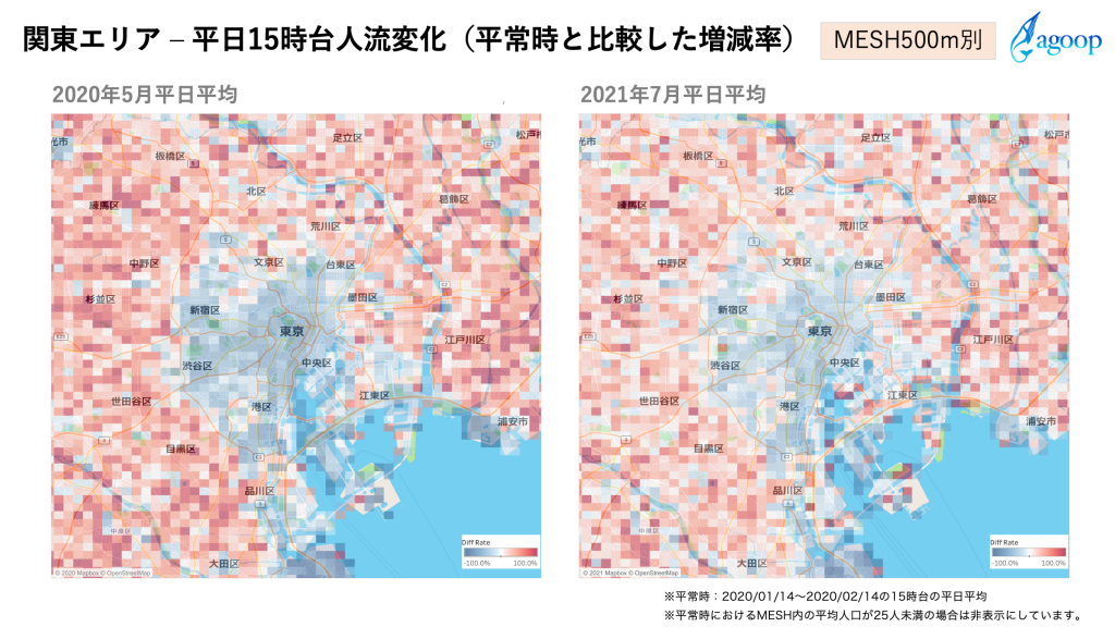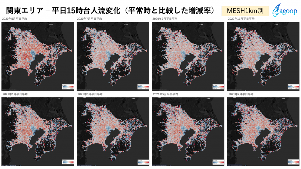 『エリア別の人流増減分析』レポートを最新版に更新しました 2021.08.06 Agoopホームページの特設サイトに掲載中の『エリア別の人流増減分析』レポートに2021年7月分を本日追加しました。 4回目緊急事態宣言が発出中の2021年7月は、引き続き都心部で人出が減少して郊外で増加している様子が続いています。 『エリア別の人流増減分析』レポートhttps://corporate-web.agoop.net/pdf/covid-19/agoop_analysis_coronavirus_fluctuation.pdfこのレポートは、経済指標正常化や感染拡大防止施策などに役立てることを目指して分析したもので、新型コロナウルス感染症の影響による人出の変化を見ることができます。今後も新型コロナウイルス感染症拡大防止対策および経済復興に関わる取り組みを支援するため、価値あるデータを提供できるようまい進していきます。 お知らせ一覧 前の記事 後の記事