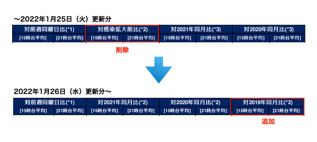 2022年1月26日より増減率表変更のお知らせ『新型コロナウイルス拡散における人流変化の解析』レポート 2022.01.25 現在、公開中の特設サイト「新型コロナウイルス感染症に関する分析」に掲載の『新型コロナウイルス拡散における人流変化の解析』レポートにつきまして、2022年1月26日(水)更新分より、主要駅レポートの増減率表(P5、P6)を変更します。 <増減率表の変更>「対感染拡大前比」を削除、「対2019年同月比」を追加 <対象のレポート>「新型コロナウイルス拡散における人流変化の解析」レポート駅 https://corporate-web.agoop.net/pdf/covid-19/agoop_analysis_coronavirus.pdf ※公開レポートは、更新タイミングの変更や障害により更新遅延や更新できない可能性もございますので、ご了承のほどよろしくお願いします。 今後も新型コロナウイルス感染症拡大防止対策および経済復興に関わる取り組みを支援するため、価値あるデータを提供できるようまい進していきます。 お知らせ一覧 前の記事 後の記事