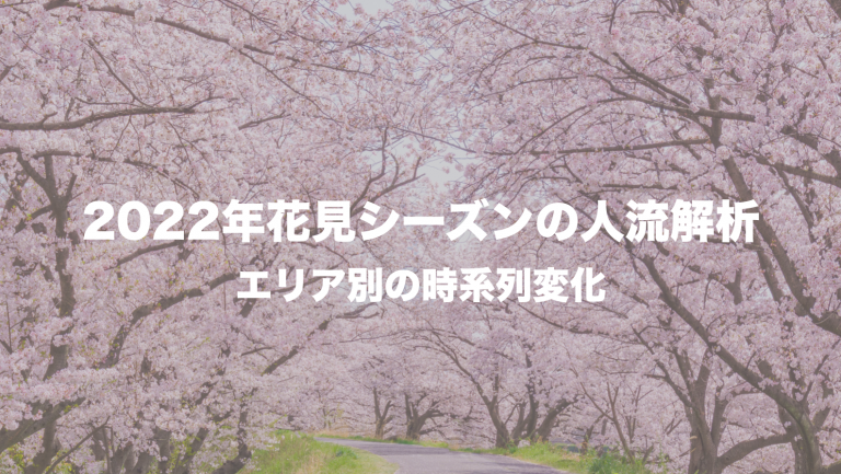 『2022年花見シーズンの人流解析』レポートを掲載しました 2022.03.14 「新型コロナウイルス特設サイト」に、『2022年花見シーズンの人流解析』レポートを本日掲載しました。長引くコロナ禍の花見シーズンの人出変化について、 Agoopが選定した18箇所の桜の名所を2019年・2020年・2021年・2022年で比較しています。ぜひご覧ください。 『2022年花見シーズンの人流解析 エリア別の時系列変化』レポートhttps://corporate-web.agoop.net/pdf/covid-19/agoop_report_sakura_2022.pdf※このレポートは本日より4月11日(月)まで週次での更新となります。 人出の混雑状況は曜日ごとに変化しますので、比較する場合は開花時期を参考に平日と休日を揃えてご覧ください。天候によっても大きく人出が変化することがございます。今後も新型コロナウイルス感染症拡大防止対策および経済復興に関わる取り組みを支援するため、価値あるデータを提供できるようまい進していきます。 お知らせ一覧 前の記事 後の記事