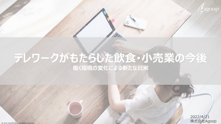 第2回「経済復興支援分析」レポートと解説動画を公開 テレワークがもたらした飲食・小売業の今後 2022.04.21 本日、第2回経済復興支援分析の「テレワークがもたらした飲食・小売業の今後 〜働く環境の変化による新たな日常〜」を掲載しました。この資料では、長引くコロナ禍により変化した私たちの生活や人々の動きを人流データにより定量的に明らかにし、手痛いダメージを受けている飲食業・小売業などでのこれからの業績回復に向けた取り組みなどを考察します。ぜひご覧ください。レポートhttps://corporate-web.agoop.net/pdf/covid-19/agoop_report_keizaifukko2.pdf解説動画https://www.youtube.com/watch?v=rFoY_SAiDKA ・「経済復興支援分析」について長引くコロナ禍により変化した主要な観光地や繁華街、首都圏の人の流れを分析した「経済復興支援分析」のレポートと解説動画を、2022年3月14日から3回にわたってAgoopのホームページに掲載します。https://agoop.xyz/2022/03/14/27377/・掲載場所新型コロナウイルス特設サイトhttps://agoop.xyz/coronavirus/・次回掲載予定第3回「様変わりした夜の繁華街 〜都心部の危機と郊外のチャンス〜」 Agoopは、今後も新型コロナウイルス感染症拡大防止対策および経済復興に関わる取り組みを支援するため、価値あるデータを提供できるようまい進していきます。 お知らせ一覧 前の記事 後の記事