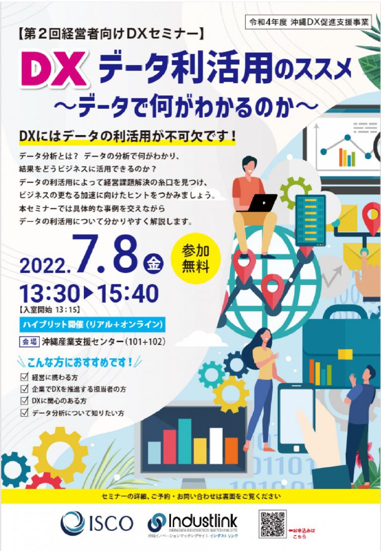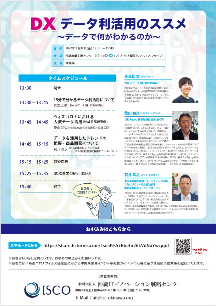 沖縄県主催「DXデータ利活用のススメ ~データで何がわかるのか~」セミナー登壇のお知らせ(7月8日) 2022.07.04 沖縄県が主催する第2回経営者向けDXセミナー「DXデータ利活用のススメ ~データで何がわかるのか~」にAgoop代表の柴山が登壇します。 「ウィズコロナにおける人流データ活用〈沖縄県解析事例〉」と題して、沖縄県の解析事例を交えた人流データの最新活用法についてご紹介します。 オンラインでも視聴が可能ですので、ご興味のある方はぜひお申し込みください。 <セミナー概要> ・タイトル 第2回経営者向けDXセミナー「DXデータ利活用のススメ ~データで何がわかるのか~」 ・講演内容 場 所:沖縄産業支援センター(101+102) & オンライン(Zoom) ・参加費 無料 ・時間 2022年7月8日(金)13:30 – 15:40 ・登壇者 株式会社Agoop 代表取締役社長 兼 CEO 柴山 和久 ・登壇時間 2022年7月8日(金)13:45 – 14:45 ・お申し込み https://industlink.jp/news/1656397076/ お知らせ一覧 前の記事 後の記事