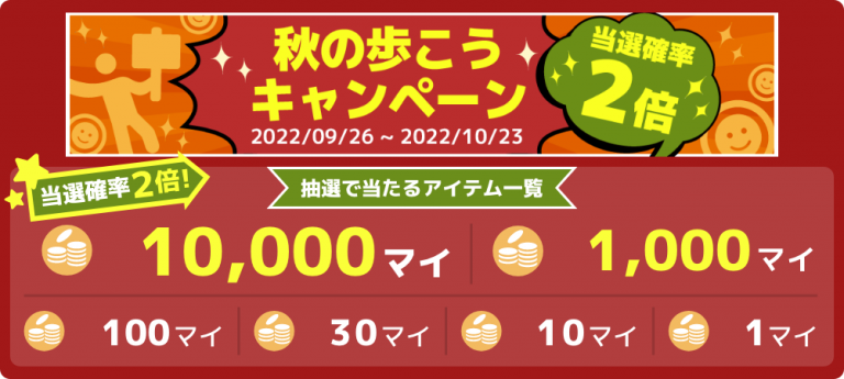 毎週月曜日から日曜日までの1週間に目標歩数などのミッションをクリアすることで、コインが最大10,000マイ当たる抽選に応募できる「WEEKLYチャレンジ」で、コインの当選確率が通常時と比べて2倍になります。また、多くのミッションを達成することで複数回の応募が可能となり、高額コインの当選確率が高くなります。