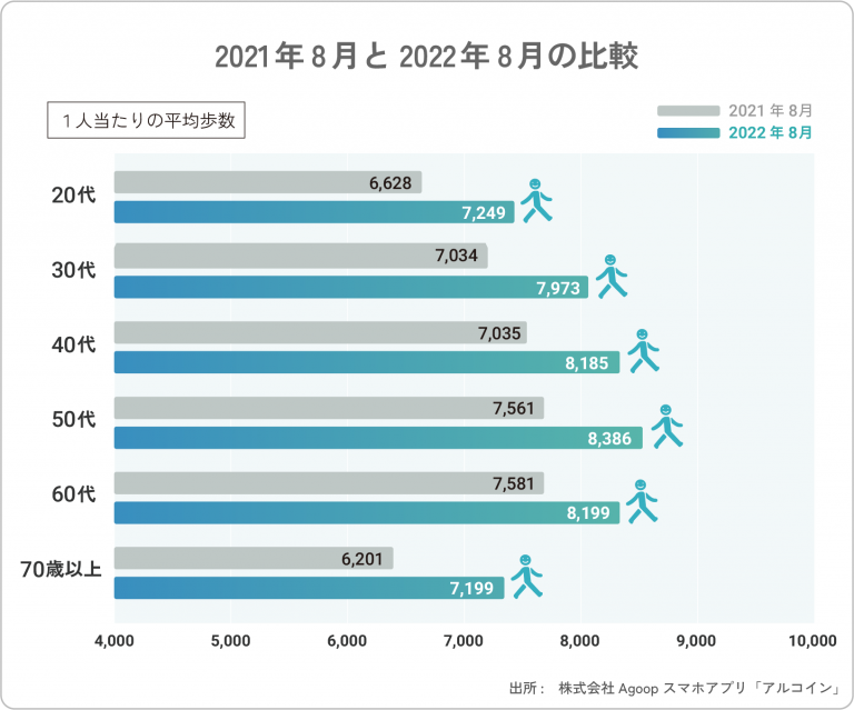 コロナ禍における外出自粛やテレワークの浸透に伴う生活様式の変化などによって、日常生活で歩く機会の減少傾向が続いていました。行動規制がない現在、「アルコイン」を利用している全世代で歩数が増加していることが、実績データから判明しています。より楽しく歩く習慣が身に付くよう、コインの当選確率が2倍になる「秋の歩こうキャンペーン」を期間限定で実施します。「アルコイン」は、健康に対する意識を高め、健康を維持するための行動変容につなげていけるよう、これからも一人一人の健康増進をサポートしていきます。