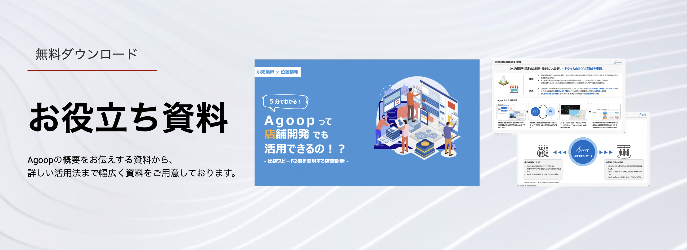 『お役立ち資料』ページを新設しました 2022.09.26 資料が無料でダウンロードできる『お役立ち資料』ページを本日9月26日(月)に公開しました。Agoopの概要をお伝えする資料から、詳しい活用法まで幅広く資料をご用意しています。今後も追加・更新してまいりますので、ぜひご覧ください。『お役立ち資料』ページhttps://agoop.xyz/document/ お知らせ一覧 前の記事 後の記事