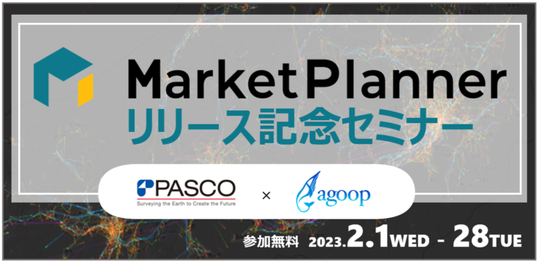2月1 〜28日開催 「 MarketPlannerリリース記念セミナー」登壇のお知らせ 2023.02.01 2023年2月1日(水)〜28日(火)パスコ・Agoop共催の「MarketPlannerリリース記念セミナー」にAgoopの藤井が登壇します。第1部では、パスコより店舗開発分野の商圏判定に特化したクラウド型商圏判定システム「MarketPlanner」のご紹介、第2部では、Agoopより人流データの活用事例や導入効果を交えて、最新の人流データ活用についてご紹介します。 無料オンラインセミナーとなりますので、ご興味ある方はぜひお申し込みください。 <セミナー概要> ・タイトル 「MarketPlanner」リリース記念セミナー ・開催期間 前期日程:2023年2月1日 (水)9:00 〜12日(日)21:00 後期日程:2023年2月13日(月)9:00 〜28日(火)21:00 ※セミナーは同内容です。 ・講演内容 <第1部>失敗しない出店戦略ツールにMarketPlanner セミナー株式会社パスコシステム事業部 事業推進部 エリアマーケティングチーム リーダー 徳本 洋之 <第2部>人流データの最新活用例と導入効果のご紹介株式会社Agoop事業推進本部 営業企画部 部長 藤井 幹 ・お申し込み https://pd.pasco.co.jp/apply-Agoop.pascoSeminar※申し込み締め切り前期・後期日程により締め切り日が異なります前期日程:2月9日 (木)後期日程:2月23日(木) お知らせ一覧 前の記事 後の記事