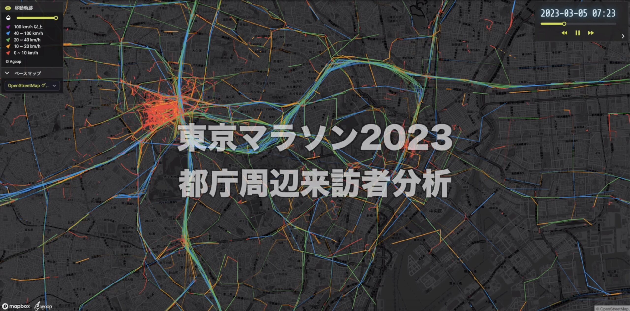 Agoopの人流データを活用した可視化事例を紹介する「人流ビジュアライズ」を公開 2023.03.07 ソフトバンク株式会社の子会社で、位置情報を活用したビッグデータ事業を手がける株式会社Agoop(アグープ、本社:東京都渋谷区、代表取締役社長 兼 CEO:柴山 和久、以下「Agoop」)は、Agoopの人流データを活用した可視化事例を紹介する「人流ビジュアライズ」をウェブサイトで公開しました。 「人流ビジュアライズ」のページでは、Agoopの人流解析ノウハウを生かした、人流の新たな見せ方を紹介していきます。第1弾として、2023年3月5日(日)に開催された「東京マラソン2023」と2023年1月25日(水)に発生した「新名神高速道路の大雪立ち往生」、2022年11月6日(日)に開催された「ぎふ信長まつり」の可視化事例を掲載しています。■「人流ビジュアライズ」のURLhttps://agoop.xyz/knowledge/■ 公開日2023年3月7日(火) ■ AgoopについてAgoopは、位置情報ビッグデータを活用する先進的企業であり、スマホアプリから大量の位置情報・センサー情報を集積して独自の技術で解析することで人の動きを見える化し、「流動人口データ」などのビジネスに新しい視点をもたらす価値ある情報を提供しています。Agoopの「流動人口データ」は、同意を得たユーザーのスマホアプリから収集される位置情報データを、秘匿加工を行った上で提供しているもので、これまでにさまざまな企業や自治体の支援を行っています。高精度かつ鮮度の高い情報を分析・活用することで、日々変化する人の動きを把握することが可能となり、街づくりや観光振興、災害対策、商圏分析などにおいて、正しい意思決定を迅速に行うことができます。https://agoop.xyz/※ 記載されている社名および商品・サービス名は、各社の登録商標または商標です。※ 記載されている情報は発表日時点のものであり、予告なく変わる可能性があります。あらかじめご了承ください。 お知らせ一覧 前の記事 後の記事