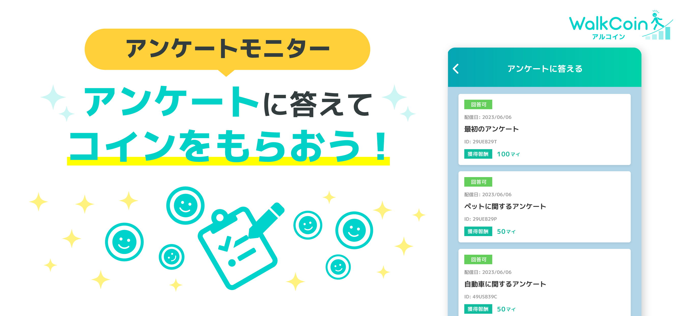 アンケートに答えてコインをGETしよう!スマホアプリ「アルコイン」で「アンケートモニター」を開始 2023.06.13 歩くだけでコインがたまり、たまったコインを電子ギフト券などと交換することができるスマホアプリ「アルコイン」を提供する株式会社Agoop(アグープ、本社:東京都渋谷区、社長:柴山 和久)は、アンケートに答えるとコインが付与される「アンケートモニター」を2023年6月13日に開始します。App Store:https://itunes.apple.com/us/app/id1449250359?l=jaGoogle Play:https://play.google.com/store/apps/details?id=jp.co.agoop.walkcoin ■「アンケートモニター」の概要1. 内容「アルコイン」アプリ内にさまざまなアンケートが配信され、日常の隙間時間などにアンケートに答えるだけでコインが付与されます。2. アンケートへの回答方法下記の手順でアンケートに回答できます。① アプリ画面の最下部にある「コイン」をタップすると表示される「アンケートに答える」をタップ② アンケートの一覧が表示され、答えたいアンケートをタップ③ アンケートに回答するとコインが付与※付与されるコインの枚数はアンケートによって異なります。 3. 開始日2023年6月13日(火)「アルコイン」を最新バージョンにアップデートしてご利用ください。最新バージョン(2023年6月13日時点)iOS : 1.66.1Android : 1.79.2 ■「アルコイン」について「アルコイン」は、通学や通勤、外出などの日常の移動でコインがたまり、たまったコインを電子ギフト券などと交換することができるスマホアプリです。歩くだけで自動的に歩数がカウントされるため、特別な操作は必要なく、簡単にコインをためることができます。また、一日の行動履歴を記録する日記機能が付いており、歩いた道のりを振り返ることもできます。 「アルコイン」のダウンロードは、こちらApp Store:https://itunes.apple.com/us/app/id1449250359?l=jaGoogle Play:https://play.google.com/store/apps/details?id=jp.co.agoop.walkcoin「アルコイン」公式サイト:https://agoop.xyz/appslib/walkcoin/「アルコイン」公式Twitter:https://twitter.com/walk_coin ※ このプレスリリースに記載されている社名および商品・サービス名は、各社の登録商標または商標です。※ このプレスリリースに記載されている情報は発表日時点のものであり、予告なく変わる可能性があります。あらかじめご了承ください。 プレスリリース一覧 前の記事 後の記事