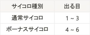 ・サイコロは通常サイコロとボーナスサイコロの2種類あり、出る目が異なります。