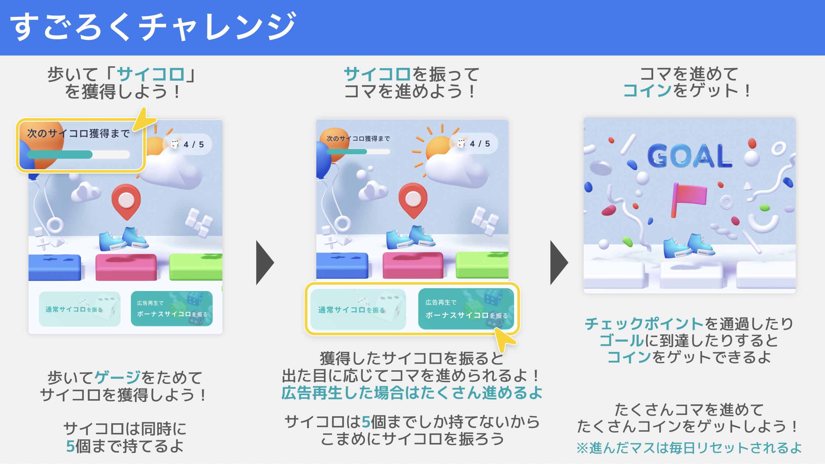 約500歩歩いてゲージがたまると、サイコロを1個獲得できます。獲得したサイコロを振ることでコマを進めて、チェックポイントを通過したり、ゴールに到達したりするとコインを獲得することができます。動画広告を再生するボーナスサイコロを振ると出る目が大きくなり、コマを早く進めることができます。なお、サイコロは5個まで同時に持つことができます