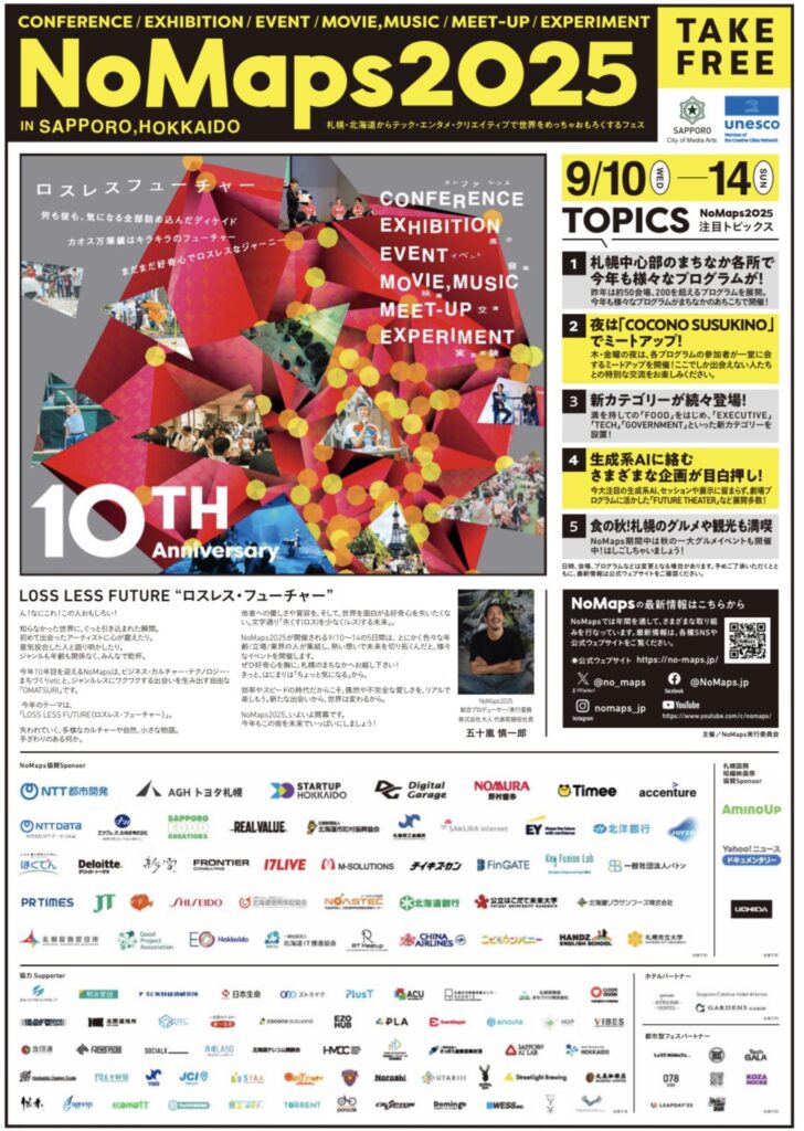 9月10日〜14日開催「NoMaps2025」人流データが描く書の未来「GRANICA」協力参加のお知らせ 2025.08.19 2025年9月10日(水)~14日(日)に開催される「NoMaps2025」において、株式会社Agoopは、書家・前田鎌利氏とNoMaps実行委員会、一般社団法人継未と共に、人流データと書を融合させたライブアートイベント『人流データが描く書の未来「GRANICA」』に協力企業として参加します。参加無料ですので、ご興味のある方はぜひご参加ください。 <イベント概要> ・イベント名 NoMaps2025 ・メインパフォーマンス 人流データが描く書の未来「GRANICA」「GRANICA」は、書道(Calligraphy)と電子音楽(Electronica)を組み合わせた造語です。筆運びや墨磨りの音を拾い上げることで、空間芸術としての書に“時間芸術”の要素を融合させます。NoMaps2025会期中の人の流れをAgoopの人流可視化分析ツール「コンプレノ」でデジタル地図上に可視化し、札幌駅前通地下歩行空間(チ・カ・ホ)の巨大デジタルサイネージに投影。“街の動き”を背景に、筆から紡ぎ出される音と書の融合によって、その場で作品を揮毫。NoMaps会場全体がキャンバスとなり、データとアートが織りなすライブアートイベントです。 ・日程:2025年9月13日(土)14:00〜14:30・会場:Sapporo north2 チ・カ・ホ北2条広場サイネージ空間(札幌駅前通地下歩行空間 北2条付近) ・サブ企画 街を巡り、書に触れるアートNoMaps2025のスタンプラリーポイントとして、前田鎌利氏の個展「ETERNAL」を開催します。歩活アプリ「アルコイン」をインストールし、街を歩きながら作品を鑑賞することで、健康促進と健康促進と感性も刺激され、心が整うウェルネス体験を提供します。さらに、「アルコイン」は同意を得た来場者の歩行データを匿名で収集し、メインパフォーマンスの作品づくりにも反映させる仕組みを取り入れています。 ・日程:2025年9月12日(金)〜14日(日)10:00〜18:00・会場:札幌市民交流プラザ SCARTS モールC(札幌市中央区北1条西1丁目) ・参加費 無料 ・関連リンク NoMaps2025公式サイトプログラム詳細ページ お知らせ一覧 前の記事 後の記事